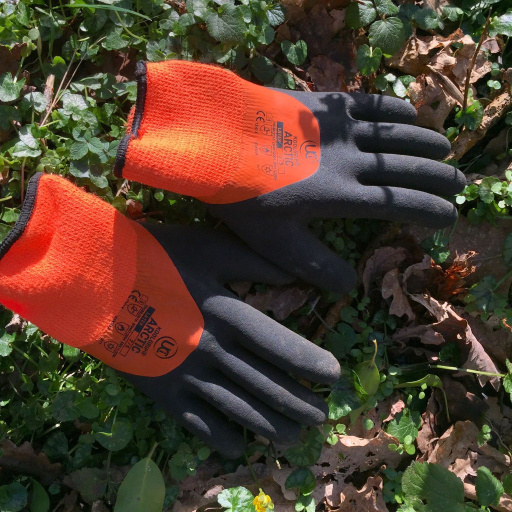 First impressions: They feel like a sturdy, decent pair of gloves. The orange colour is great as it’s highly visible in a woodland setting so not easy to lose amongst the bracken. With a thin fleece lining inside, they slid comfortably onto my smaller hands. There was still a little bit of room to manoeuvre but not loose enough that they would slip off. Glove fingers were thick and spongy but not too thick that you can’t feel what you’re holding. Throughout the day of clearing brash and handling timber they stayed on nicely and the fleece lining made it warm too. Mud didn’t tend to stick to it too badly and it was easily brushed off the ‘fine pebble dash like’ coating.