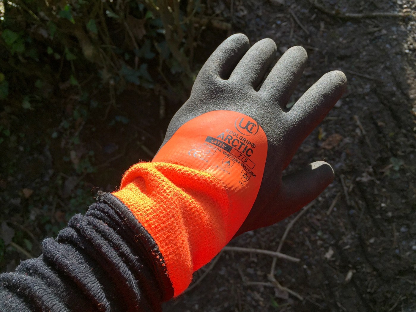 First impressions: They feel like a sturdy, decent pair of gloves. The orange colour is great as it’s highly visible in a woodland setting so not easy to lose amongst the bracken. With a thin fleece lining inside, they slid comfortably onto my smaller hands. There was still a little bit of room to manoeuvre but not loose enough that they would slip off. Glove fingers were thick and spongy but not too thick that you can’t feel what you’re holding. Throughout the day of clearing brash and handling timber they stayed on nicely and the fleece lining made it warm too. Mud didn’t tend to stick to it too badly and it was easily brushed off the ‘fine pebble dash like’ coating.