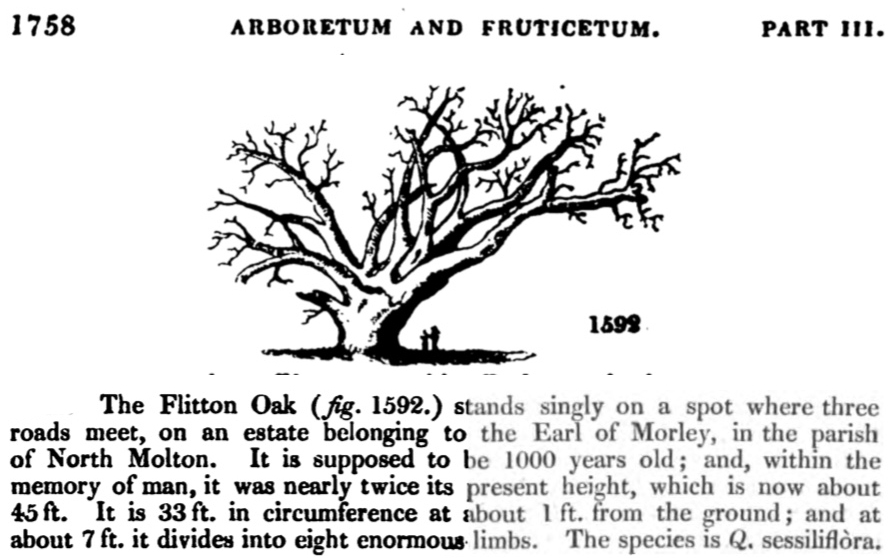 Very little information can be found about the Flitton Oak, from this composite screenshot I made from the ‘Arboretum And Fruiticetum’ book written over 100 years ago.