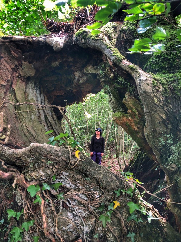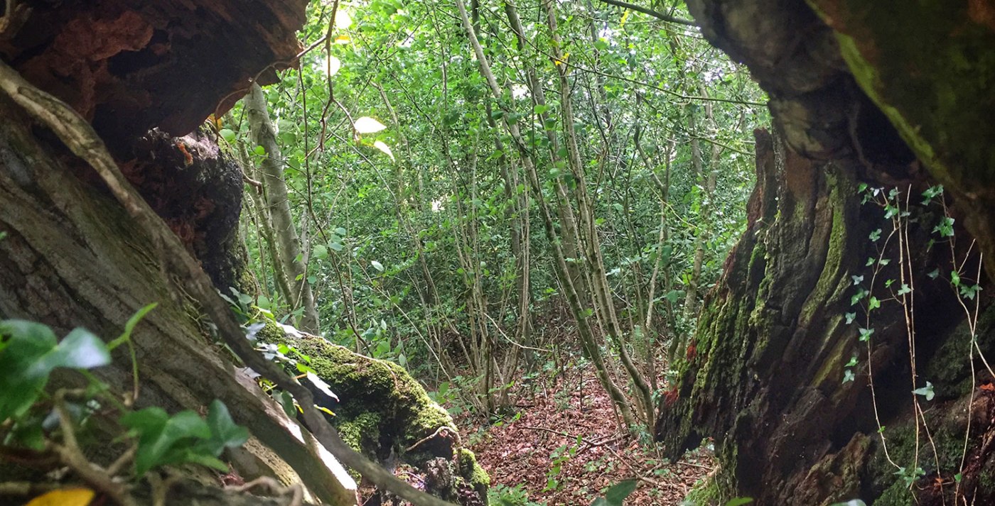 It was exactly what I did. Standing there in the hollow of this ancient sessile oak, I looked around at the beautiful inner textures of this tree: year after year of withstanding the elements, fungi, decay, deer and squirrel damage, and losing its heartwood slowly, steadily but bravely. The Flitton Oak was still very much alive, a long limb manually propped up still bursting with the epicormic growth of green oak leaves. In addition, it was supporting thousands of other species like moss, lichen, ferns, ivy, fungi and invertebrates. This wasn’t even counting where beetles would feed, bats would roost, and birds would bring up their young in the many burrows in its stem, splits in its branches and cracks in its bark. The ecological importance of this ancient oak was absolutely stunning. I was utterly and completely mesmerised.