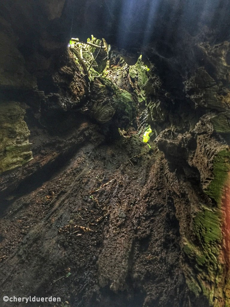 It took a matter of about 15 steps before a looming giant revealed itself amongst the younger trees; slowly, a large limb drew the eye to where the limb originated from, and there stood proudly a massive, magnificent being that had borne witness to the transience of time. In the middle of this tree was a large cavity, enough for two people to stand in.