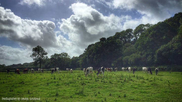 Coming out of the wood, we were greeted by a lovely lone oak silhouetted against the afternoon sun. The wind whipped up our hair once again as we strolled across a field of cows grazing nonchalantly, obviously used to the presence of their two legged compatriots.