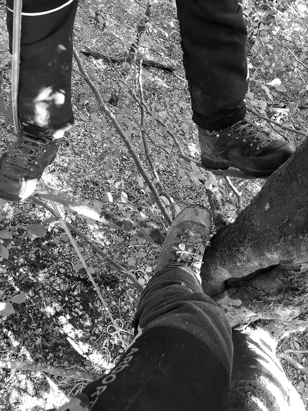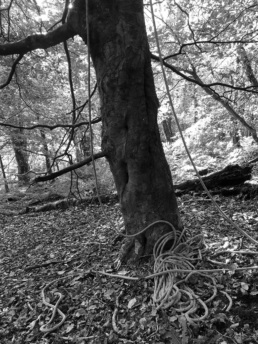 After some deliberation we selected a nice beech tree that wasn’t too difficult to scale with a decent height to start with. Sam went first, setting up his ropes and then mine, while I fiddled with my harness at ground level.