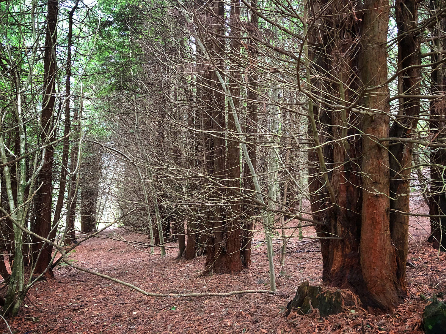 A sloping plantation of larch appeared on our right and another plantation of what looked like coppiced Coast Redwood (Sequoia sempervirens) flanked our left; this quickly became a mosaic wooded habitat with broadleaved trees.